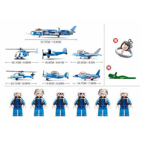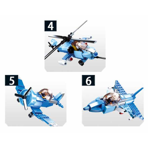 Bộ đồ chơi này bao gồm sáu mô hình máy bay phản lực chiến đấu khác nhau, tạo nên một trải nghiệm đa dạng và hấp dẫn. Các mô hình này có thể được lắp ráp và tháo rời linh hoạt, cho phép trẻ em tận hưởng niềm vui của việc sáng tạo và tự tay tạo ra những tác phẩm độc đáo.