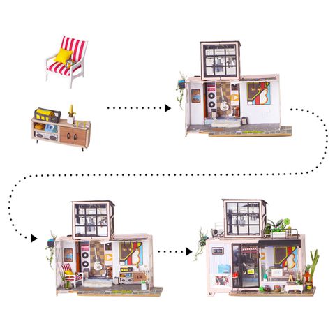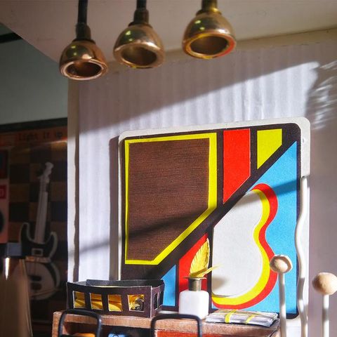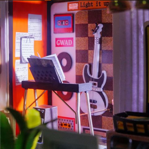 Giới thiệu: Đây là một studio âm nhạc thu nhỏ theo phong cách hiện đại mà bạn có thể xây dựng bằng tình yêu thương. Một văn phòng sản xuất âm nhạc sống động với trang bị âm thanh như guitar, đầu đĩa CD và máy nghe nhạc âm thanh nổi, bass, loa, bàn phím điện tử và trống châu Phi.