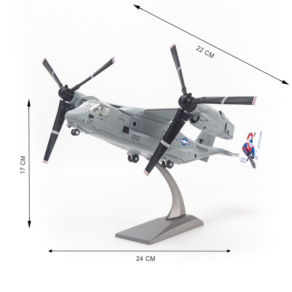 Mô hình V-22 Osprey này được chế tạo ở tỷ lệ 1:72, là một kích thước lý tưởng để hiển thị chi tiết tỉ mỉ trong từng bộ phận của máy bay. Mô hình này mang lại một cái nhìn chân thực về thiết kế độc đáo của Osprey, với hai cánh quạt lớn có thể xoay ngang để bay như một máy bay thông thường hoặc xoay đứng để cất và hạ cánh như một trực thăng.