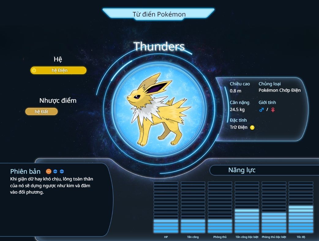 Jolteon có khả năng kiểm soát và phát điện nhanh chóng, làm cho nó trở thành một trong những Pokemon điện đáng sợ nhất. Với bộ lông điện chớp mạnh mẽ bao phủ cơ thể, Jolteon có thể tạo ra một lớp điện áp mạnh mẽ để bảo vệ bản thân khỏi các cuộc tấn công. Điều này cũng làm cho nó trở thành một Pokemon khá khó bị tấn công bằng các đòn tấn công điện hoặc sử dụng các chiêu thức của loại Ground.