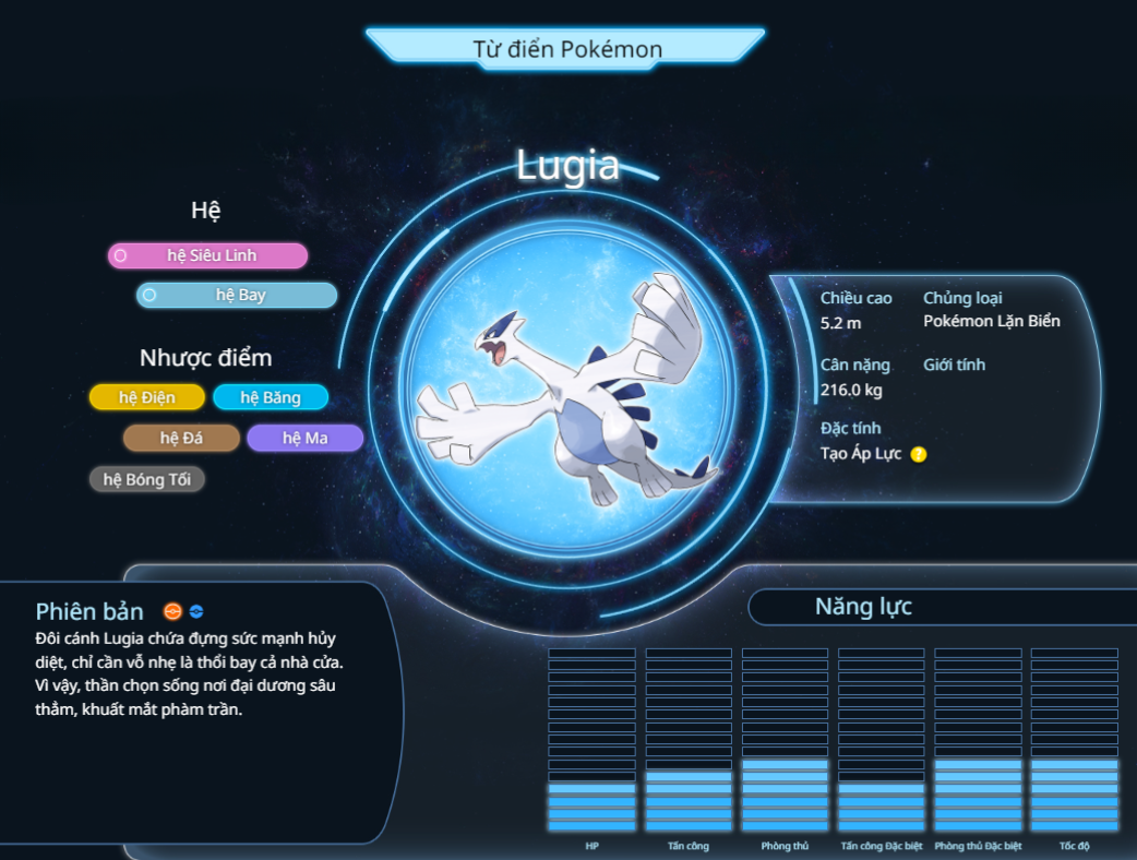 Lugia là một Pokémon huyền thoại thuộc thế hệ thứ hai trong vũ trụ Pokémon, nổi tiếng với sức mạnh và vẻ đẹp huyền bí của mình. Được biết đến như "Thần Thủy Long," Lugia mang trong mình một vẻ đẹp ấn tượng và sức mạnh không thể phủ nhận.