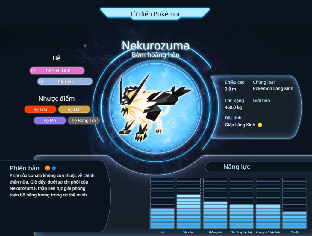 Nekurozuma (Tasogare) là một trong những loài Pokemon đặc biệt thuộc hệ Bóng Tối và Giả Hỏa. Với hình dáng độc đáo và đầy bí ẩn, Nekurozuma thu hút sự chú ý của người huấn luyện bởi vẻ đẹp quyến rũ và sức mạnh đáng kinh ngạc.